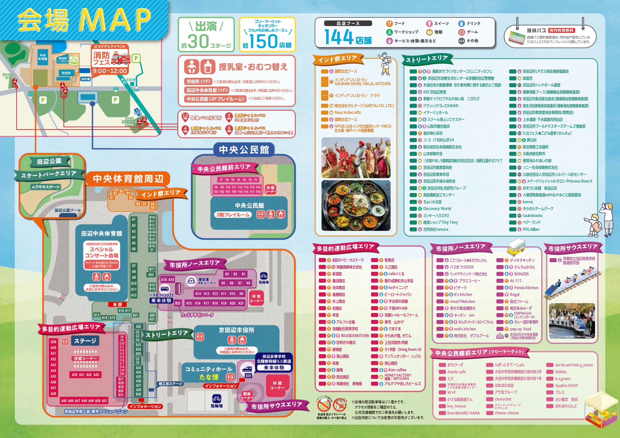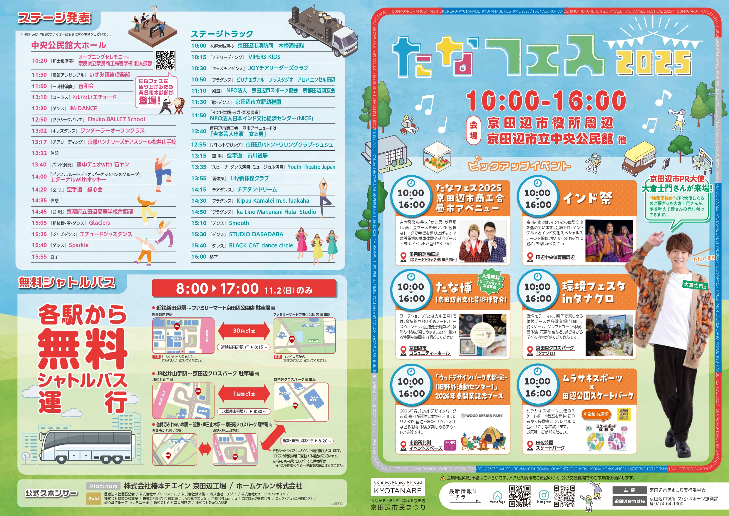 2025.10.28 11月2日(日)京田辺市民まつり『たなフェス』が開催されます! 昨年度約37,000人が来場した『たなフェス』が今年も開催!「つながる・楽しむ・誇れる京田辺」をコンセプトに、京田辺市の文化・産業・観光が一堂に集まる、京田辺市をまるごと体感できるオール京田辺の例年大盛況のフェスティバルです!今年は模擬店、フリーマーケットが約150店舗、音楽やダンス等も約30ステージ繰り広げられます。また、イベント当日10時20分より、オープニングセレモニー公演として中央公民館大ホールにて奈良県立奈良商工高等学校 和太鼓部による『和太鼓演奏』が披露されます。【時間】10:20~【会場】中央公民館大ホールこちらの公演には“地元愛強め”な京田辺市PR大使の大倉士門さんがゲスト出演される予定です!また、大阪府泉佐野市様、千葉県習志野市様、福井県小浜市様、山梨県山梨市様など京田辺市と都市間交流をさせていただいている各市のブース出店もございます!ぜひ皆様お揃いでお越しくださいませ!京田辺市をまるごと楽しめるこの機会をお見逃しなく!【日時】2025年11月2日(日)10:00~16:00【会場】京田辺市役所 周辺京田辺市立中央公民館 他【主催】京田辺市民まつり実行委員会★詳細はこちら★京田辺市民まつり「たなフェス」公式サイト TANAFES2025_day-pamphlet_page-0001 TANAFES2025_day-pamphlet_page-0002 たなフェス2024➀ たなフェス2024② Tweet Share +1 【終了しました】10月24日(金)『あしたのぱん』京た…前の記事