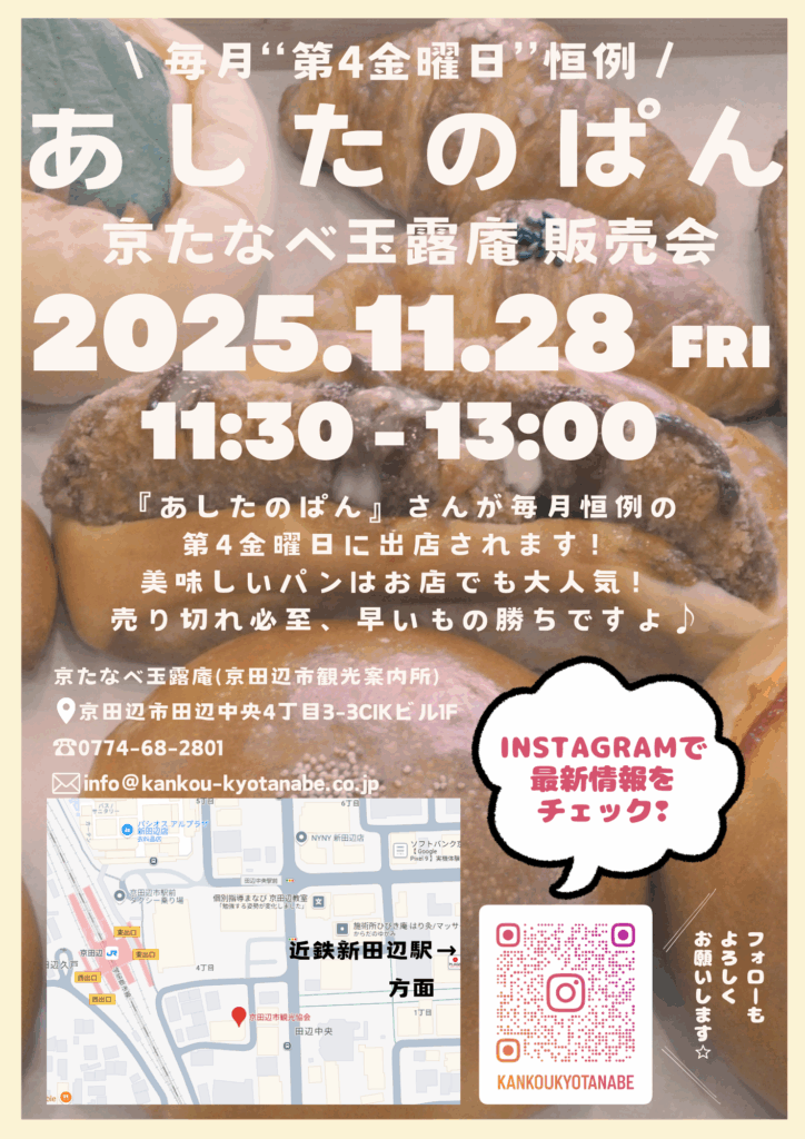2025.11.26 11月28日(金)『あしたのぱん』京たなべ玉露庵特別販売会を行います! 毎月恒例となりました、連日大好評の『あしたのぱん』さんの美味しいパンを京たなべ玉露庵にて販売いたします!売り切れ次第終了いたしますので、お早目のお越しをお待ちしております!あしたのぱんさんは毎月第4金曜日に出店されます!(祝日の場合は別日に変更する場合があります)ぜひお立ち寄りくださいませ。【日時】令和7年11月28日(金)11時30分~13時00分(※売り切れ次第終了)【場所】京たなべ玉露庵(京田辺市観光案内所) 京田辺市田辺中央4丁目3-3 京田辺市商工会館1階 JR学研都市線「京田辺駅」東口より徒歩1分 駐車場:有(京田辺市商工会館駐車場へお停めください) 11.28(金)あしたのぱん Tweet Share +1 11月25日(火)京田辺市観光案内所(京たなべ玉露庵)…前の記事 12月5日(金)『手づくりの岡田屋』京たなべ玉露庵特別…次の記事