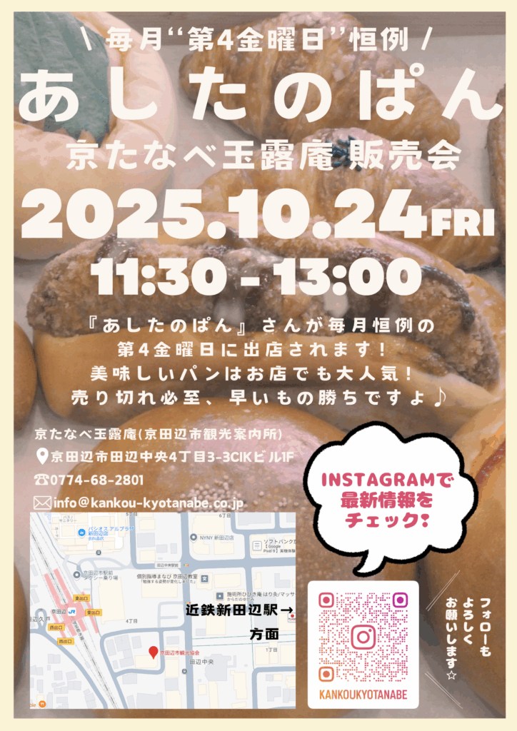 2025.10.18 10月24日(金)『あしたのぱん』京たなべ玉露庵特別販売会を行います! 毎月恒例となりました、連日大好評の『あしたのぱん』さんの美味しいパンを京たなべ玉露庵にて販売いたします!売り切れ次第終了いたしますので、お早目のお越しをお待ちしております!あしたのぱんさんは毎月第4金曜日に出店されます!(祝日の場合は別日に変更する場合があります)ぜひお立ち寄りくださいませ。【日時】令和7年10月24日(金)11時30分~13時00分(※売り切れ次第終了)【場所】京たなべ玉露庵(京田辺市観光案内所) 京田辺市田辺中央4丁目3-3 京田辺市商工会館1階 JR学研都市線「京田辺駅」東口より徒歩1分 駐車場:有(京田辺市商工会館駐車場へお停めください) 10.24(金)あしたのぱん Tweet Share +1 10月23日(木)『舞妓の茶本舗』京たなべ玉露庵特別販…前の記事