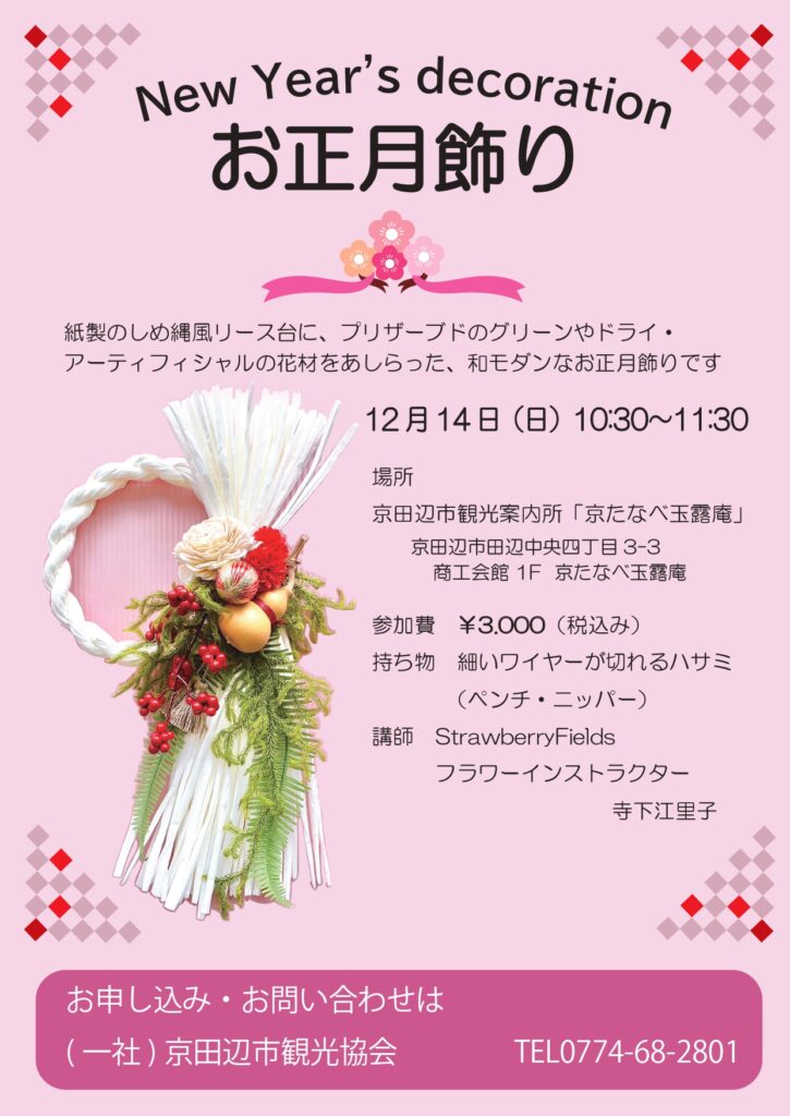 2025.11.8 12月14日(日)『ストロベリーフィールズ』お正月飾りづくりワークショップを行います! 12月14日(日)『ストロベリーフィールズ』お正月飾りづくりワークショップを行います!紙製のしめ縄風リース台にプリザーブドのグリーンやドライ・アーティフィシャルの花材をあしらった、和モダンなお正月飾りをつくります。オリジナルのお正月飾りで、新年の門出をお祝いしませんか。【日 時】令和7年12月14日(日)10:30~11:30【場 所】京たなべ玉露庵(京田辺市観光案内所) 京田辺市田辺中央4丁目3-3CIKビル1階【参加費】3,000円(材料費・講習費・消費税込み)【定 員】先着6名【持ち物】細いワイヤーが切れるハサミ(ペンチ・ニッパー等)をお持ちください。【駐車場】あり。商工会館駐車場をご利用ください。【参加お申し込み・お問い合わせ先】(一社)京田辺市観光協会 TEL:0774-68-2801(火~日曜日午前9時~午後5時) 「お正月飾り」2025.12.14 Tweet Share +1 10月1日(水)9時より「大御堂観音寺ライトアップ」宿…前の記事